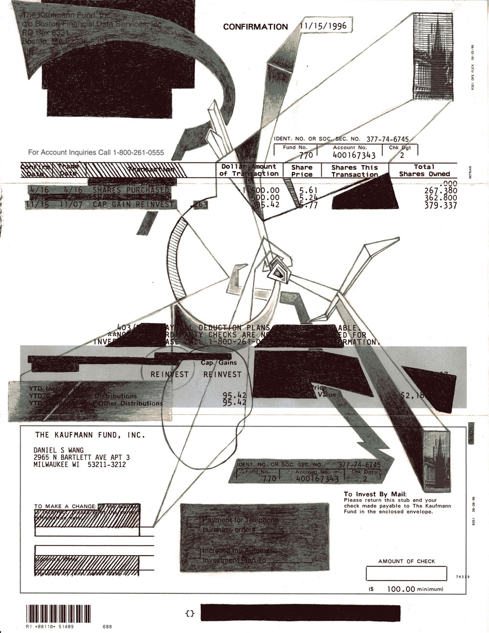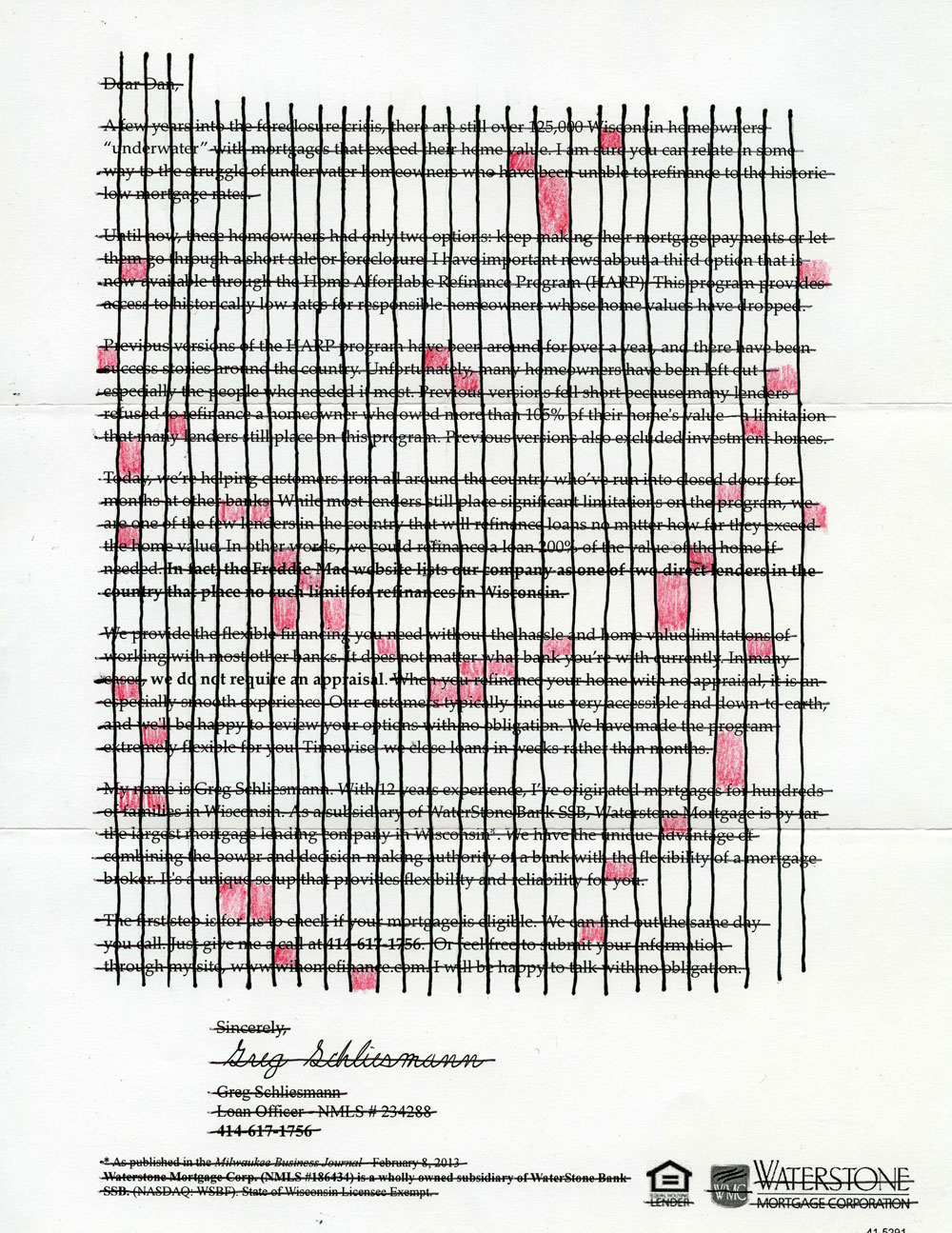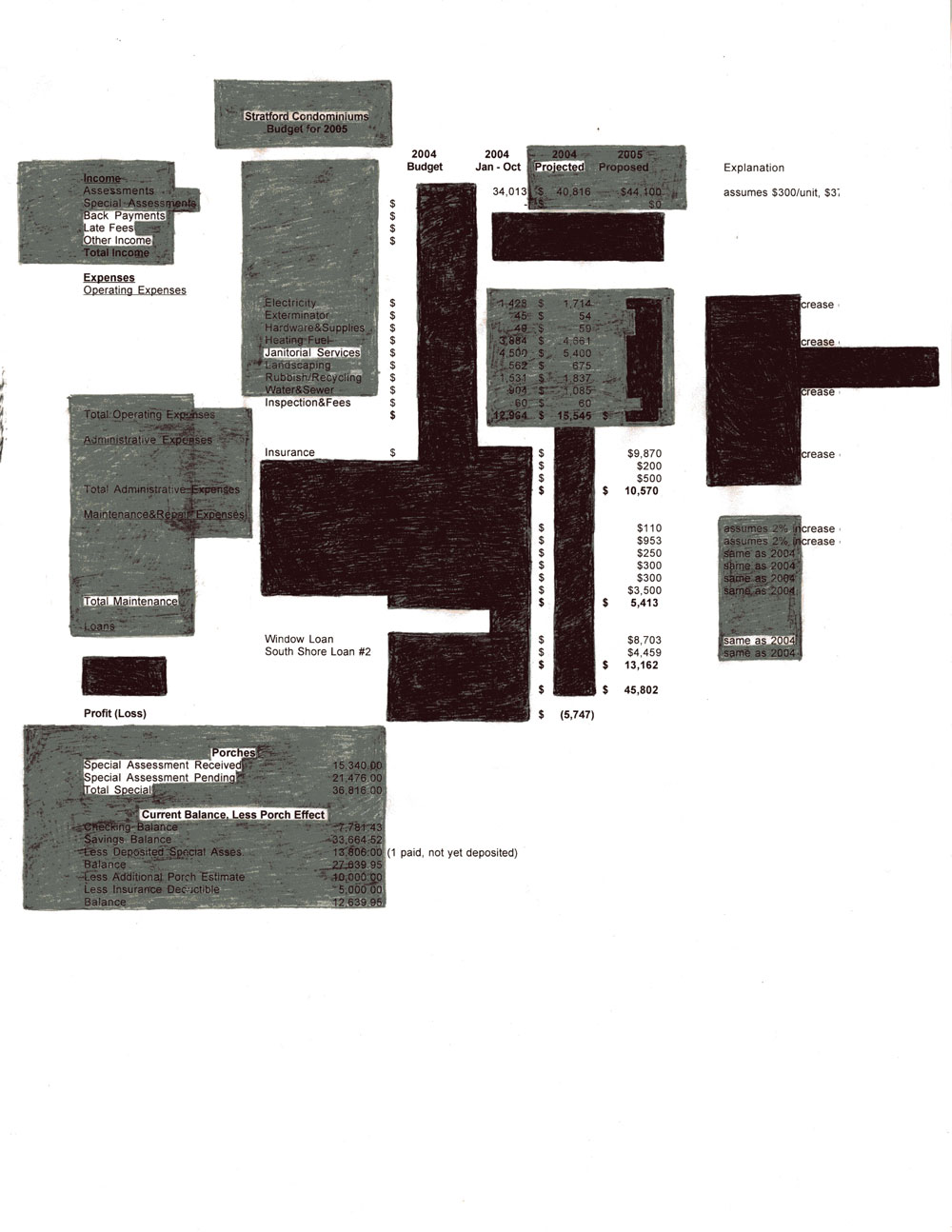 Drawings that mark up various castaway documents of modern financialized, capitalized, marketized, and amortized life. The methods are ballpoint pen redactions, graphite interventions, pasted paper and concrete text. From 2006 on.