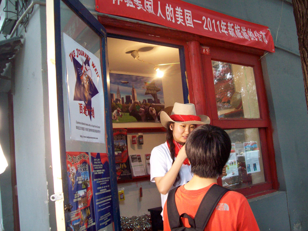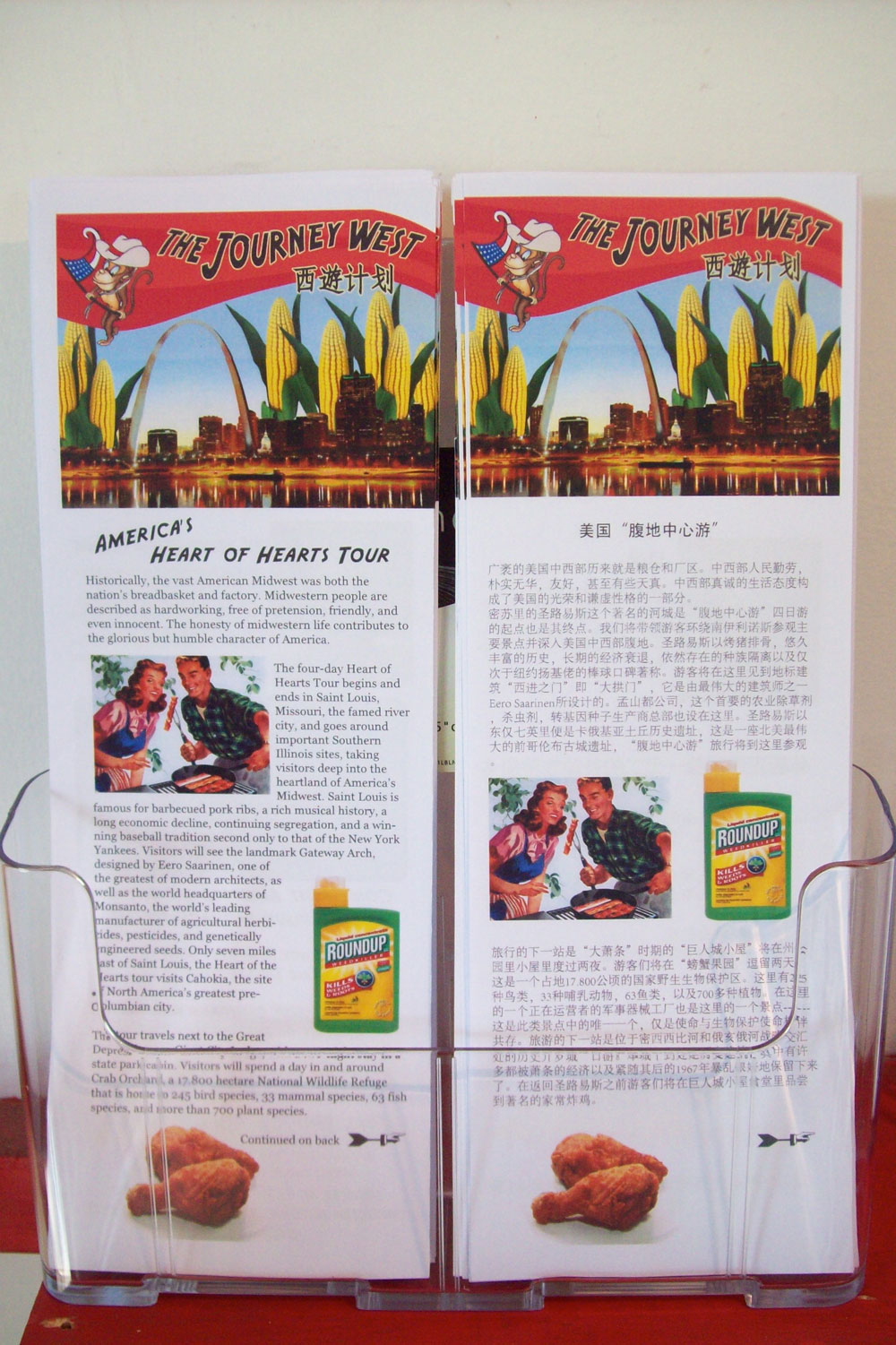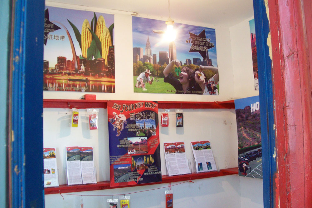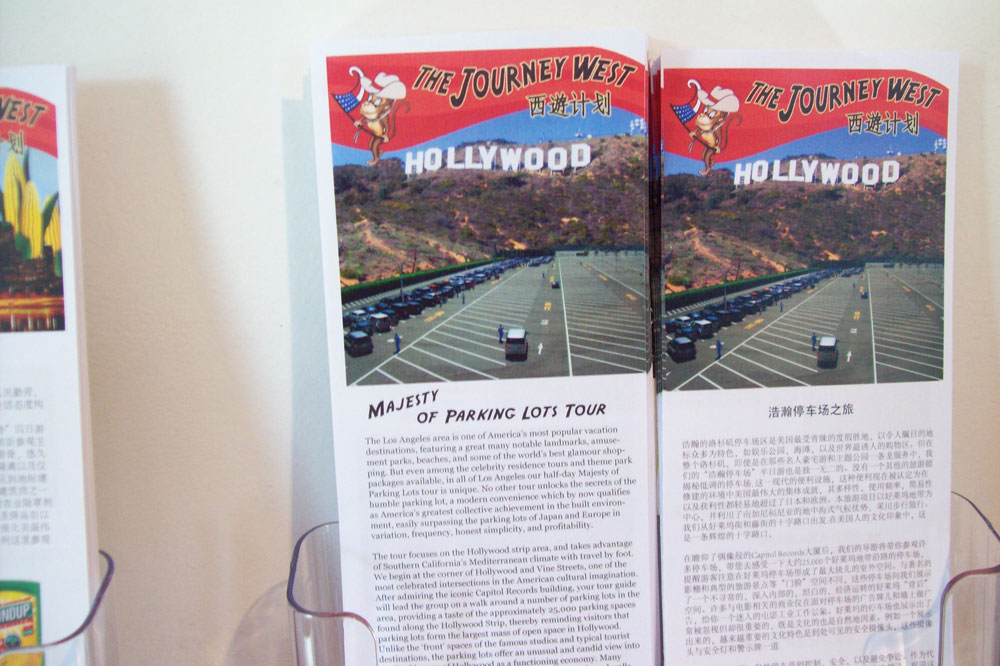 The Journey West grew out of an interest with the exploding cultures and economies of tourism in China, a fascination shared with my collaborator for this project, the new media artist Stephanie Rothenberg. This was our effort to reach—or perhaps help to create—the critical tourist hailing from China. Beginning with a travel office near the Drum Tower in Beijing and later moving online, The Journey West offered a selection of four premium packages covering different parts of the United States. The Journey West made imaginable a new level of engaged touring for the Chinese traveler who wishes for a well-researched and politically informed American tour, and expects some excellent Chinese food, as well.