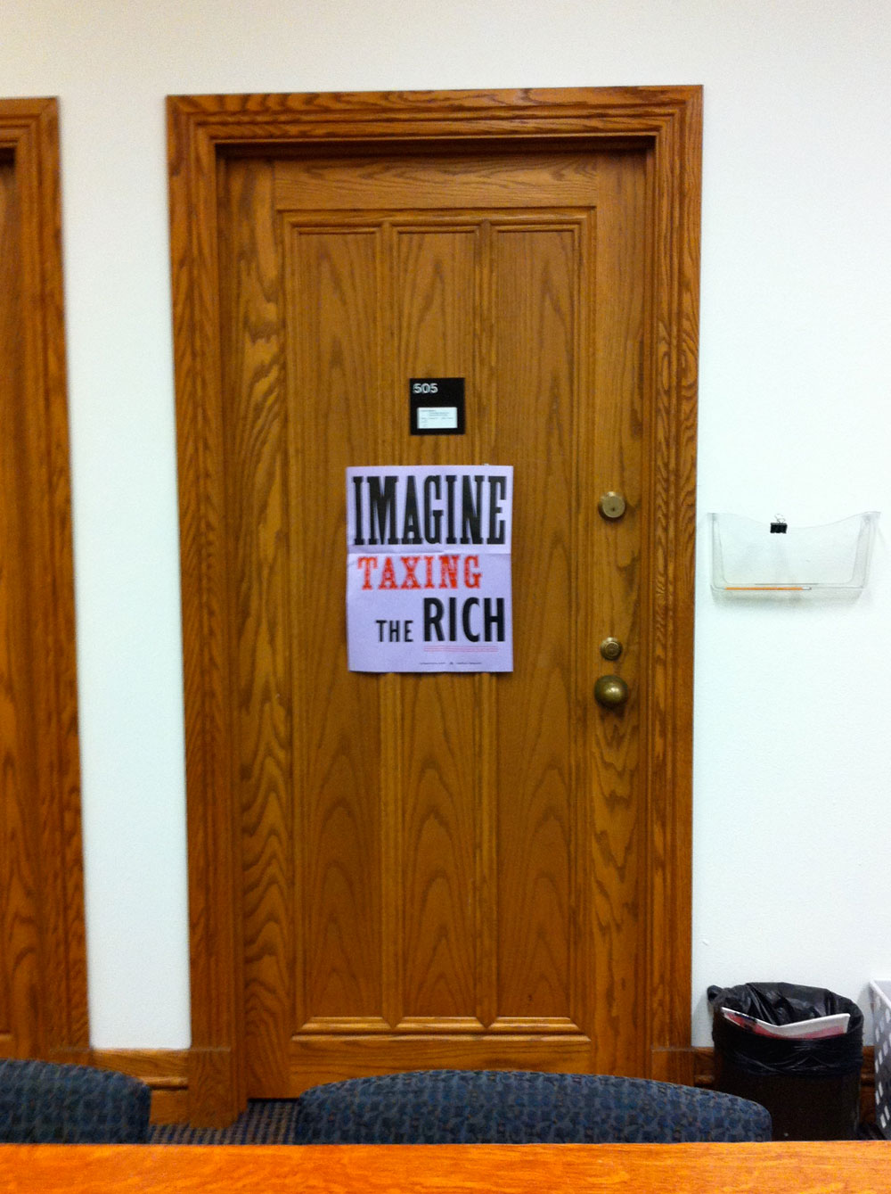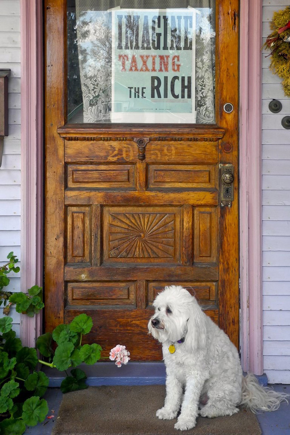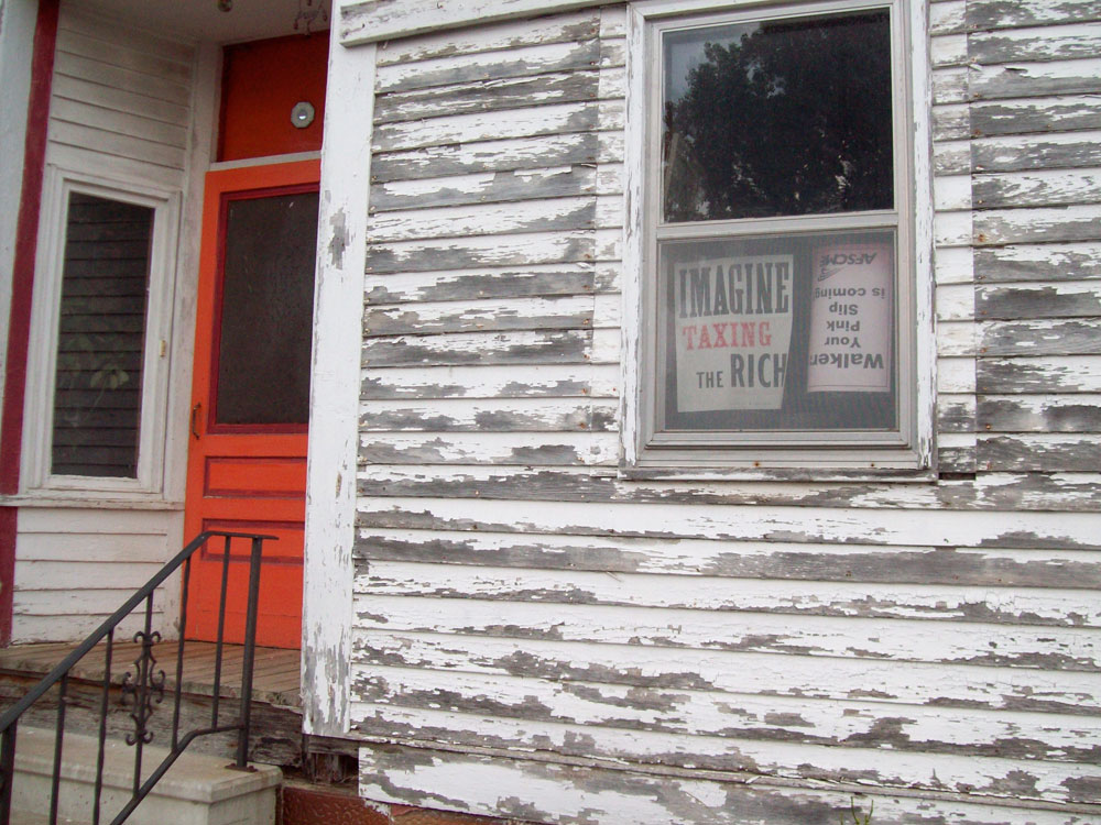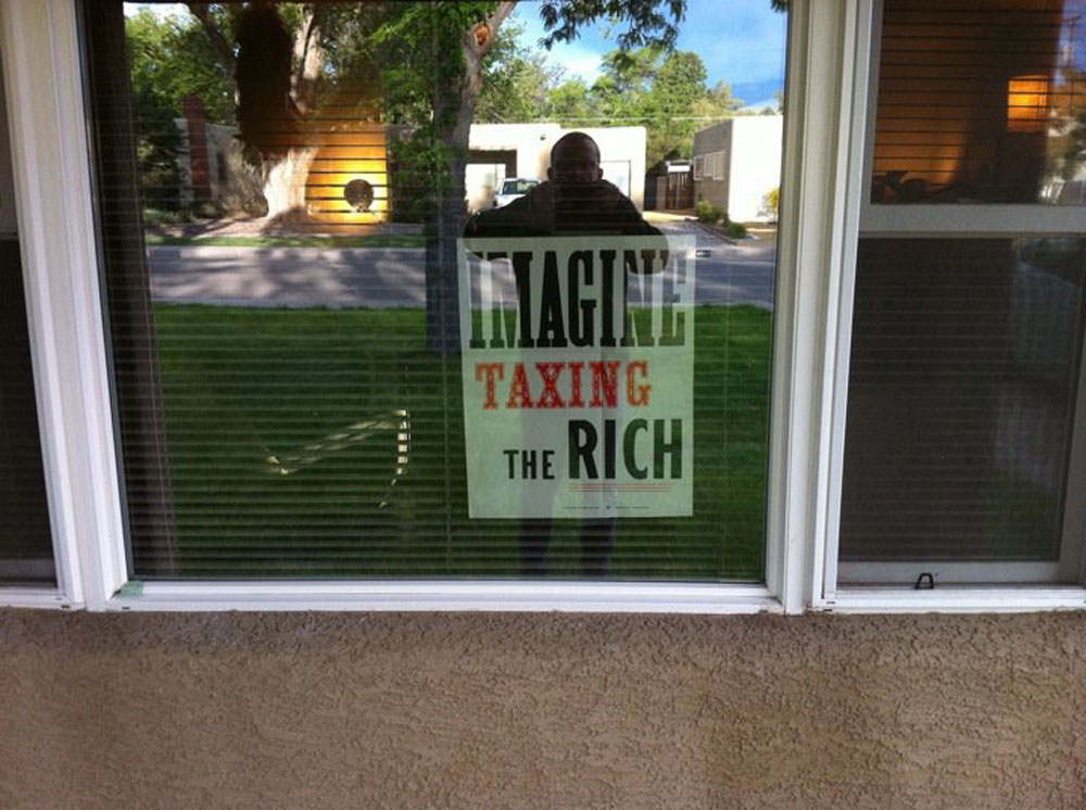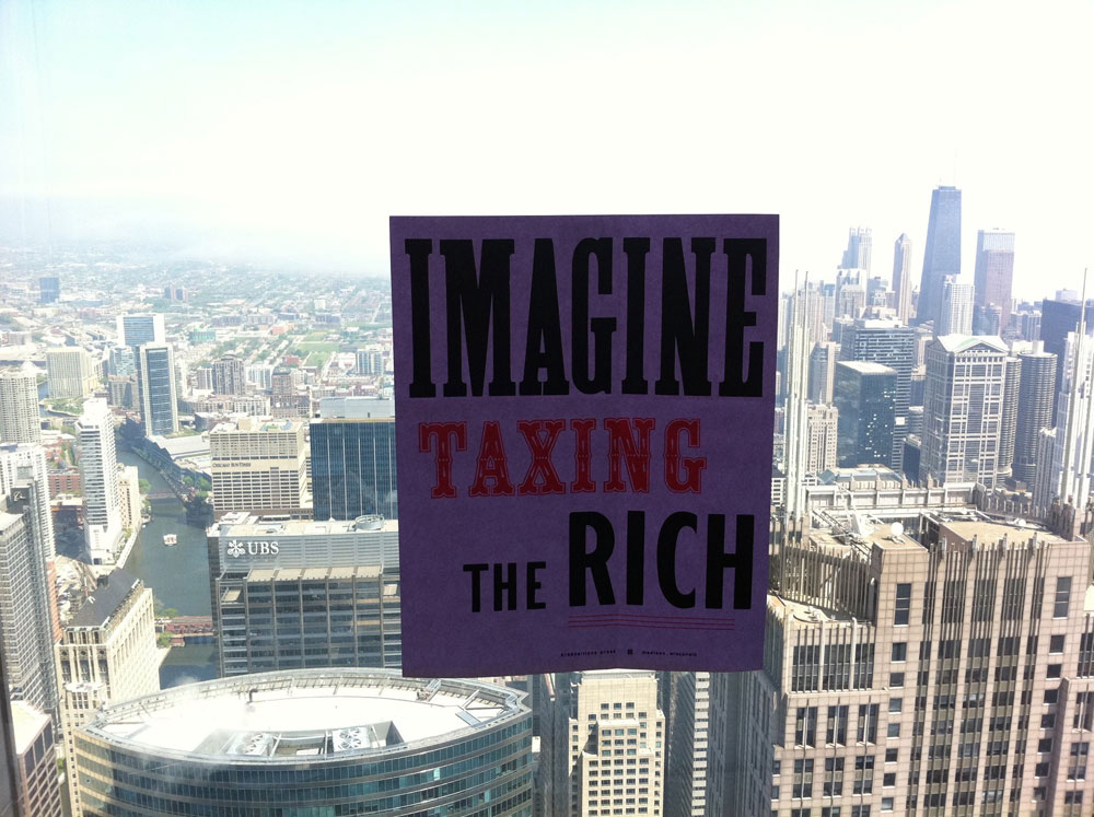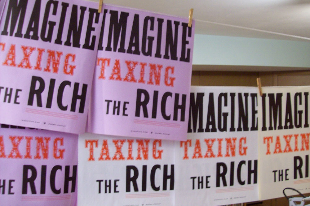 Imagine Taxing The Rich was a simple exercise in recursive dissemination. I printed thirty-two posters using the usual wood and metal type. I mailed them to social media contacts from around town and from around the country who agreed to post them and send me a picture. I compiled the pics which were then recirculated as picture albums on social media. As argued by the economist Thomas Piketty, raising taxes on the rich is the only way to decelerate the fast widening wealth gap, both within and across countries. In the United States the tax conversation is dominated by the anti-tax hard right. But this did not happen overnight. As most thinking people know, income taxes were set well upwards of 70% for the top brackets back in the 1950s and 60s. I believe that leftists can reverse the demonization of taxing the wealthy. Every extra advertisement for taxing counts for something. A poster or placard carrying pro-tax/anti-rich language, detached from any particular campaign and therefore long-lived, helps to do the work.