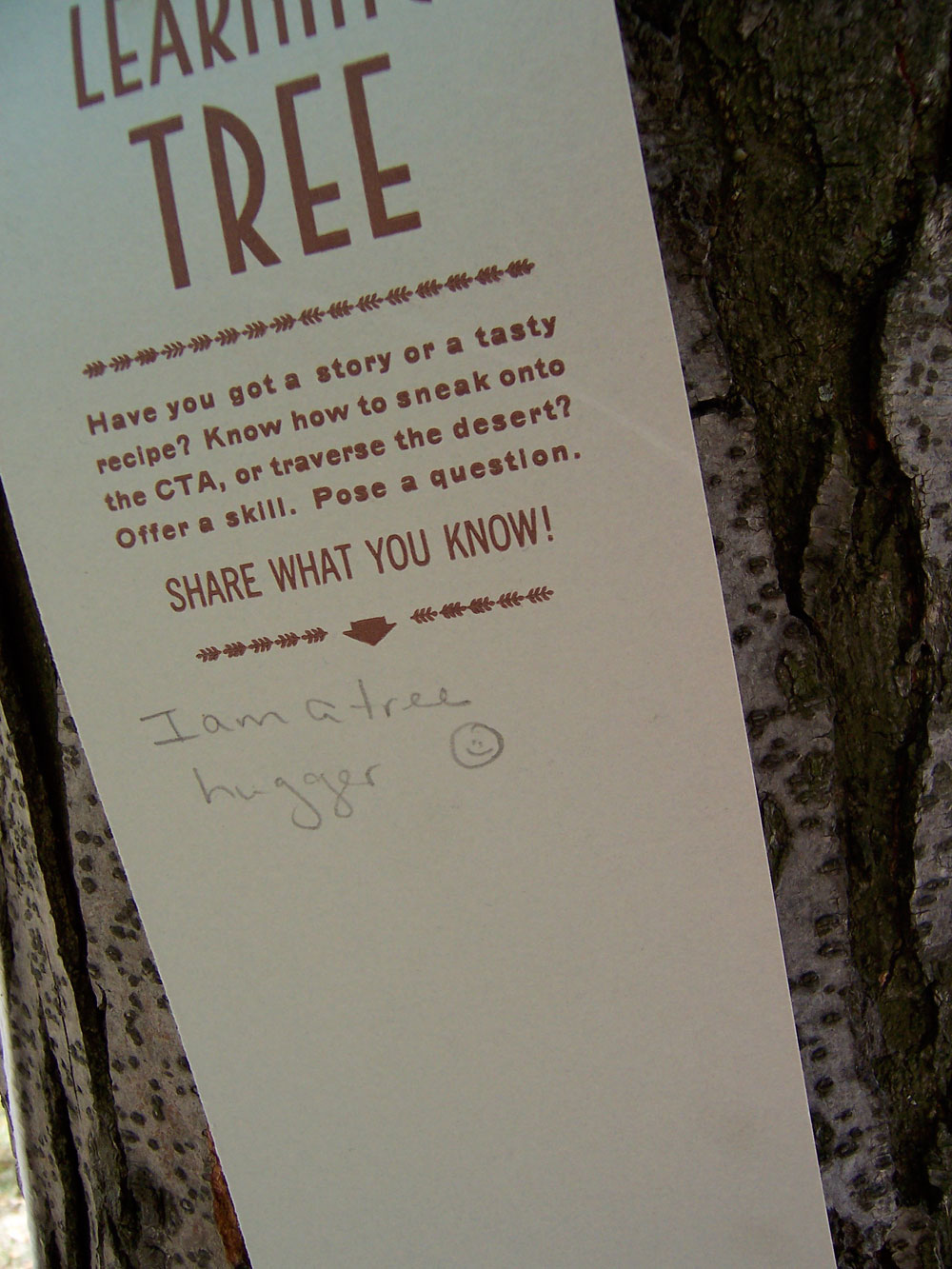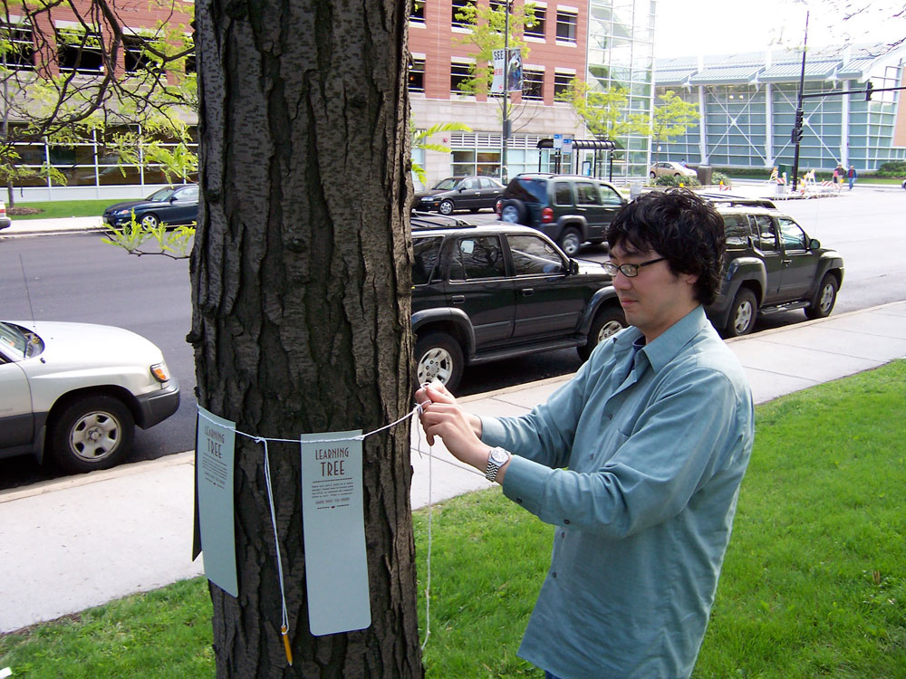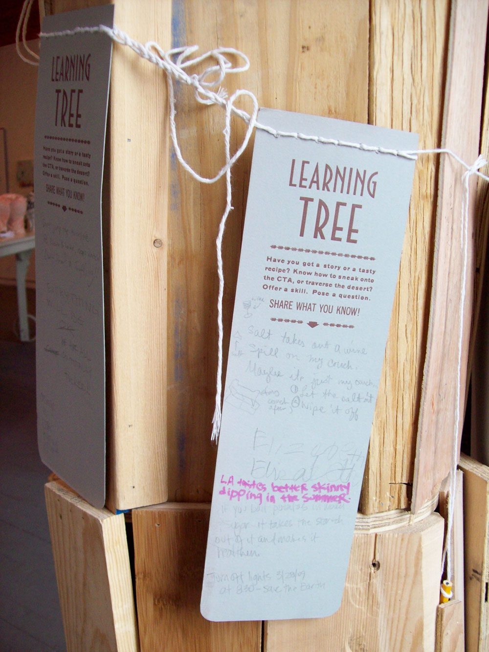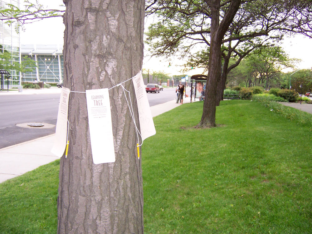 Learning Tree Myriel Milicevic stayed with us in Chicago for about a week. Her scheduled flights gave her a few days free after her installation was done and her show opened. Seeing the print shop, she wondered if we could make use of it to produce a simple participatory gesture. Along with Kevin Haywood, we planned, printed, and assembled Learning Tree—a string of cards with pencils to be tied around tree trunks, with a message of invitation printed on them—in a day. Anonymous sidewalk passers-by completed the work. Later, the work was shown in Without You I Am Nothing, a show about participatory print media. Curiously, despite the exhibition theme, the gallery show produced less robust participation than when the cards were put out along the street.