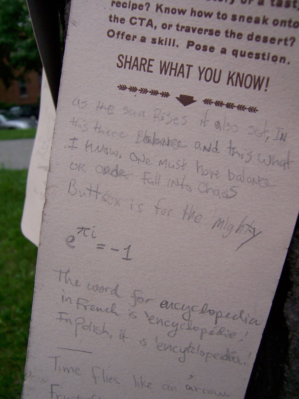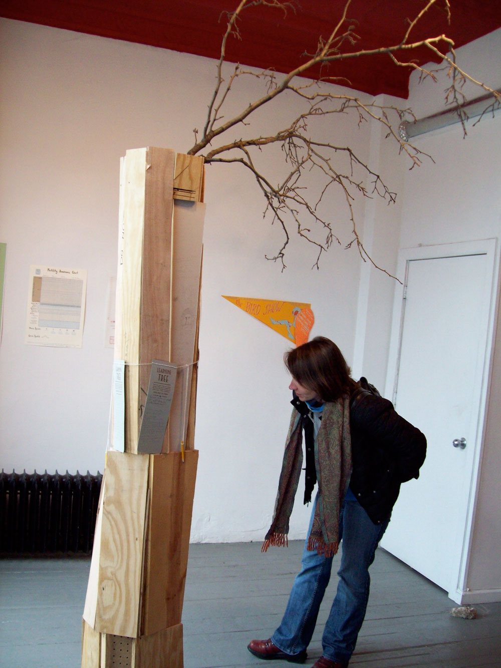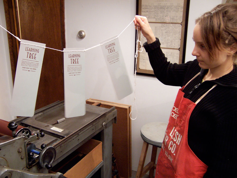 Learning Tree Myriel Milicevic stayed with us in Chicago for about a week. Her scheduled flights gave her a few days free after her installation was done and her show opened. Seeing the print shop, she wondered if we could make use of it to produce a simple participatory gesture. Along with Kevin Haywood, we planned, printed, and assembled Learning Tree—a string of cards with pencils to be tied around tree trunks, with a message of invitation printed on them—in a day. Anonymous sidewalk passers-by completed the work. Later, the work was shown in Without You I Am Nothing, a show about participatory print media. Curiously, despite the exhibition theme, the gallery show produced less robust participation than when the cards were put out along the street.