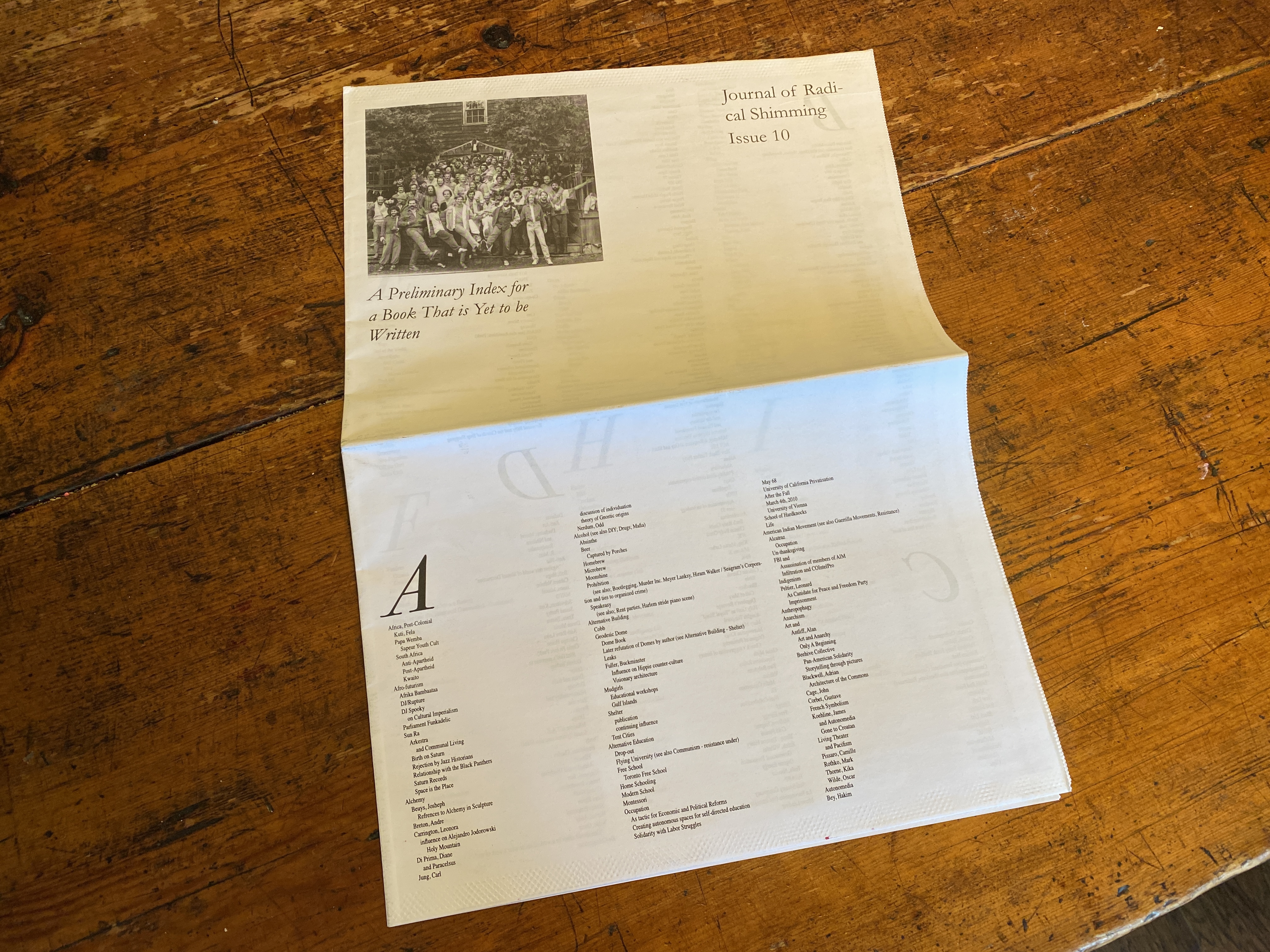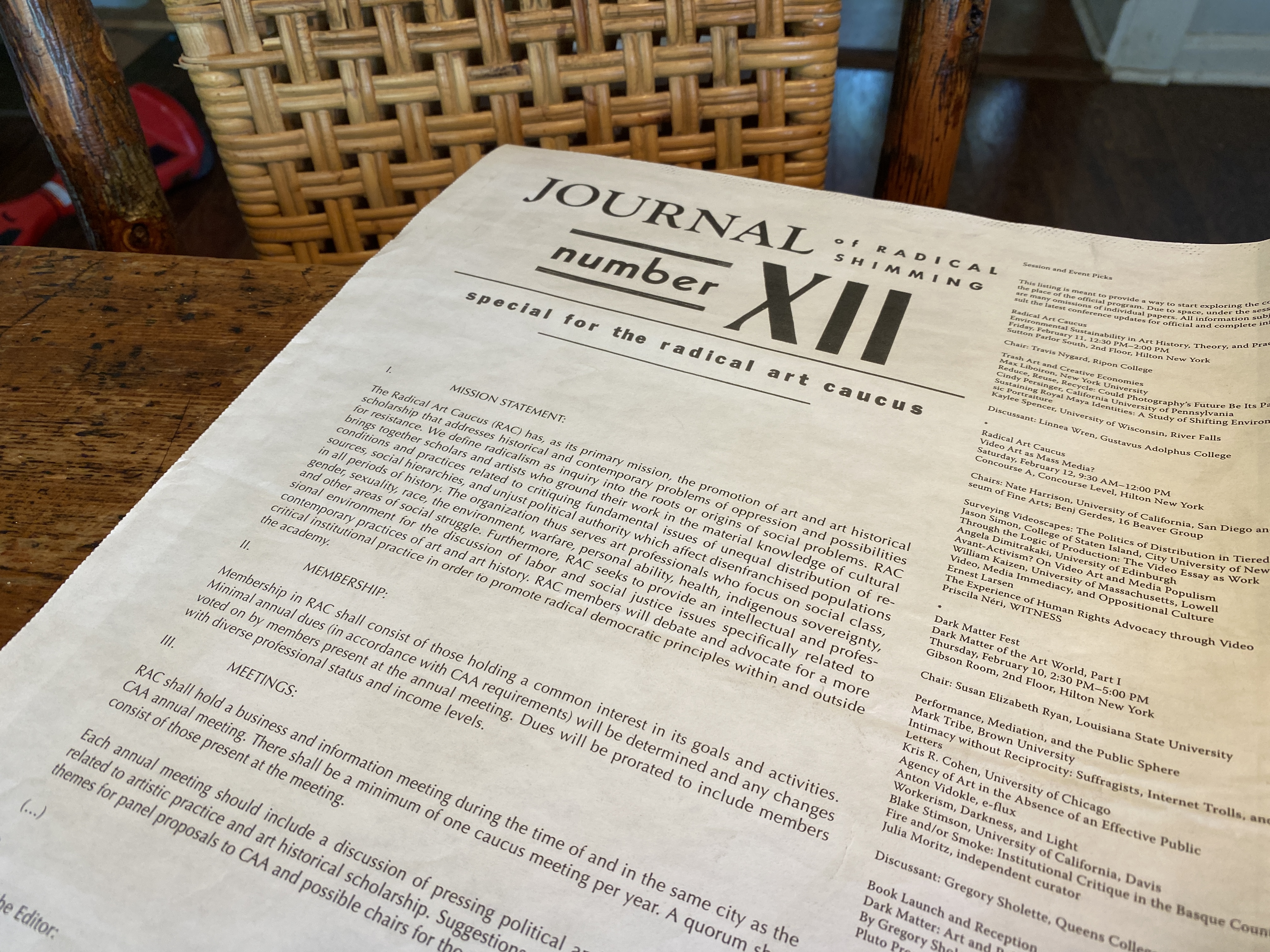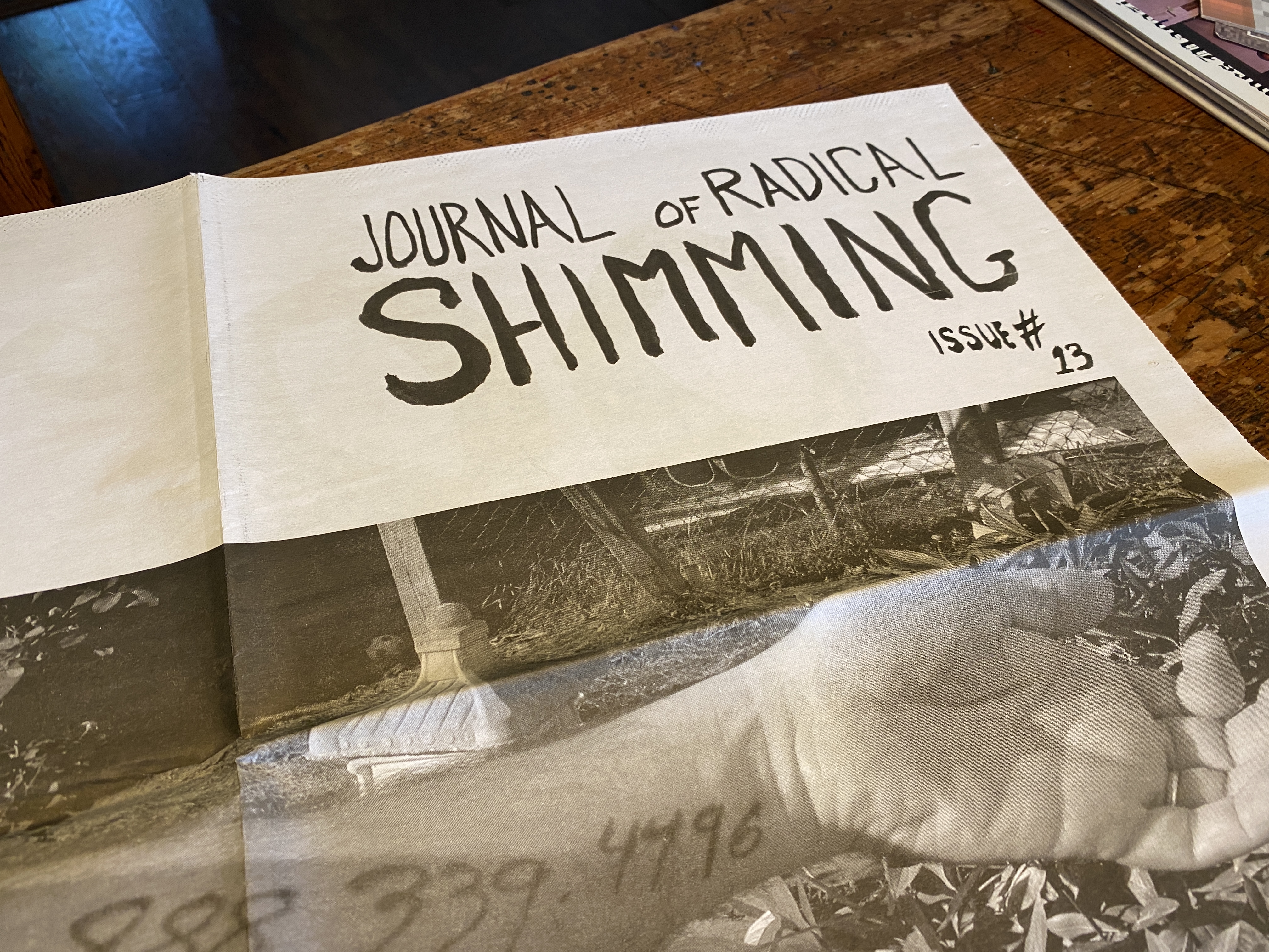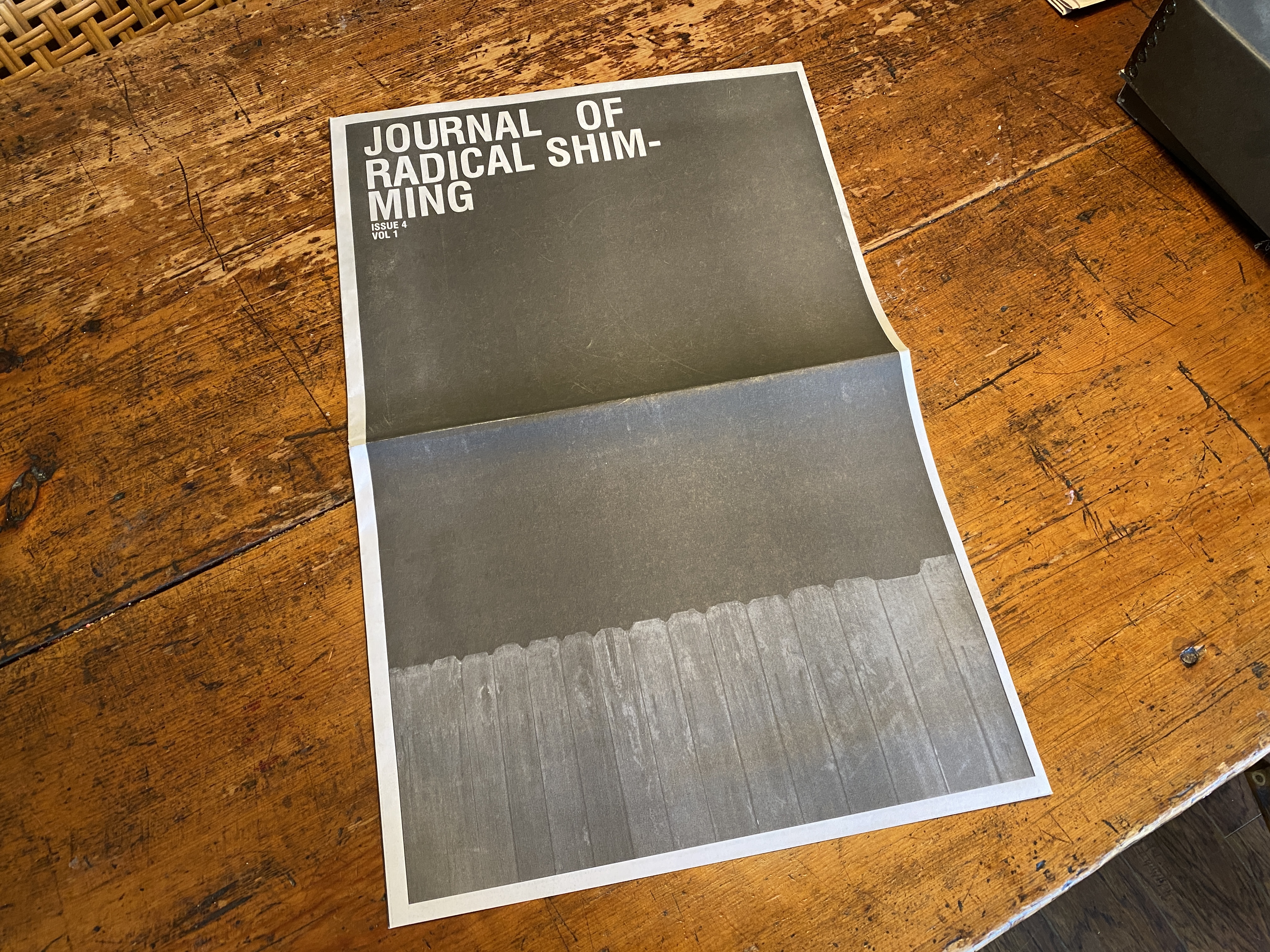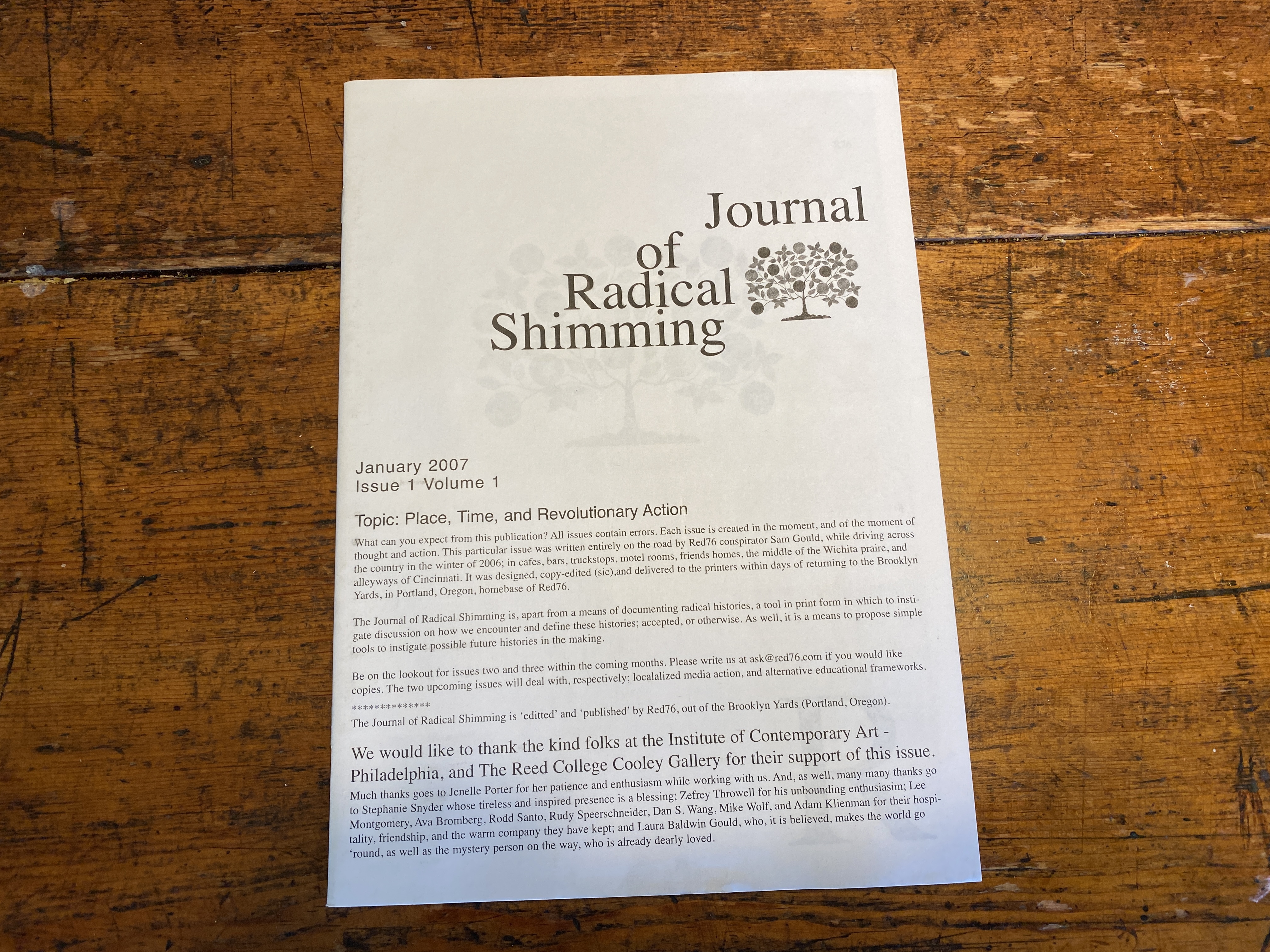 The Journal of Radical Shimming was founded in Portland, Oregon. It was first distributed through a commission from the Institute of Contemporary Art, Philadelphia and the Cooley Gallery at Reed College. Released intermittently, the JRS was edited and most often designed by Sam Gould, in continued collaboration with Dylan Gauthier, Gabriel Mindel Saloman, and many others.