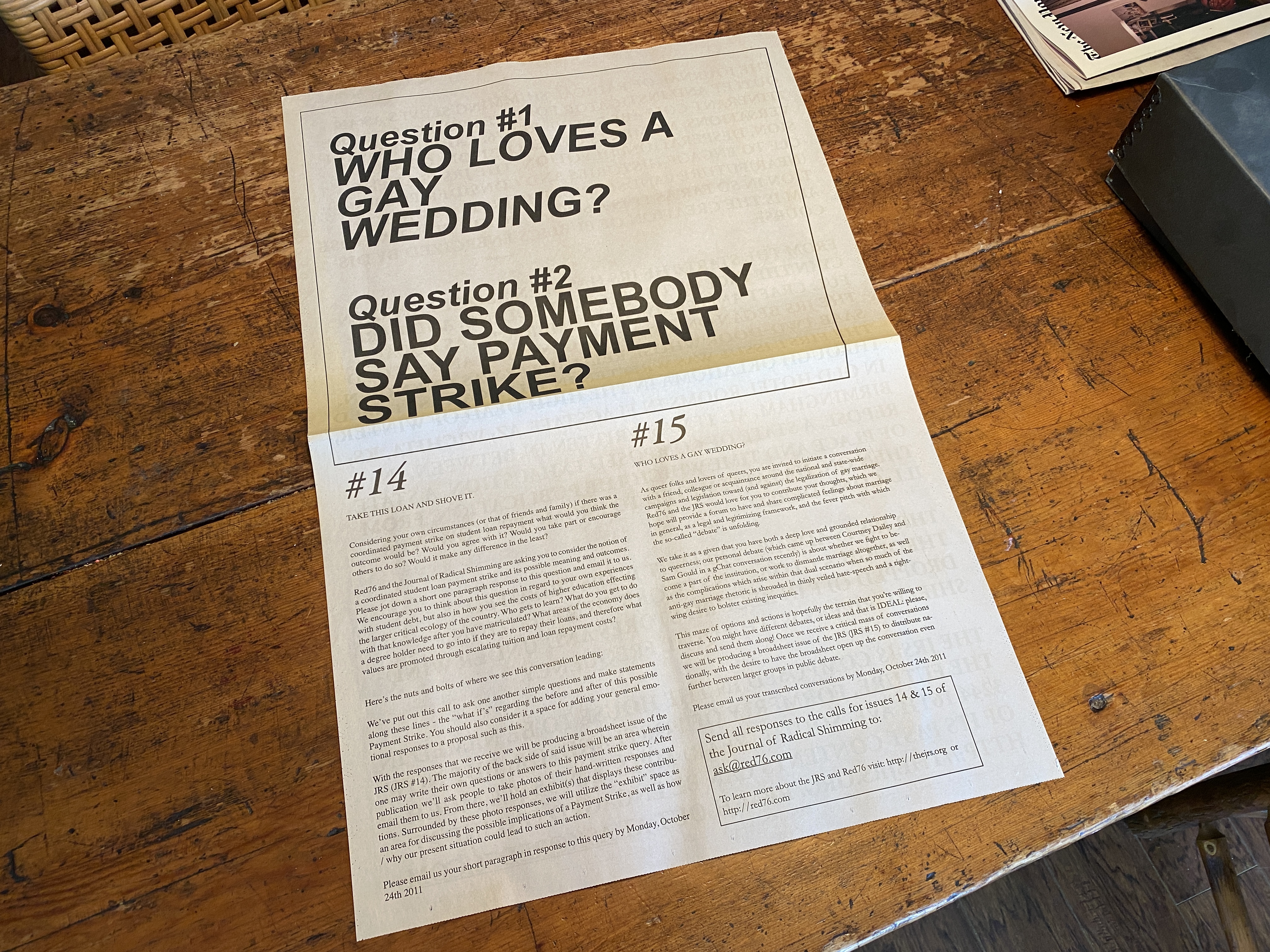 Established in 2007 at the beginning of Red76’s initiative Revolutionary Spirit (2007 – 2009), the JRS acted as a tool for the group to convene, consider, and promote ideas between public actions as well assist in materializing publics, a means of linking disparate publics which might manifest from one Red76 project to the next.