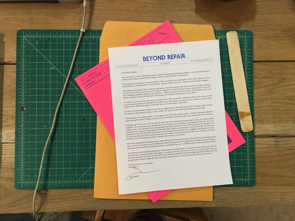 The completed run of 300 copies of Sgt. Kroll Goes to the Office was ready for distribution. But before a public announcement was made select copies were sent to the entity of the Minneapolis City Council, the Mayor, the Chief of Police, and the Governor with a letter describing the context and process of creating the comic, the interrogation transcript that spawned it, and the projects intended desires.