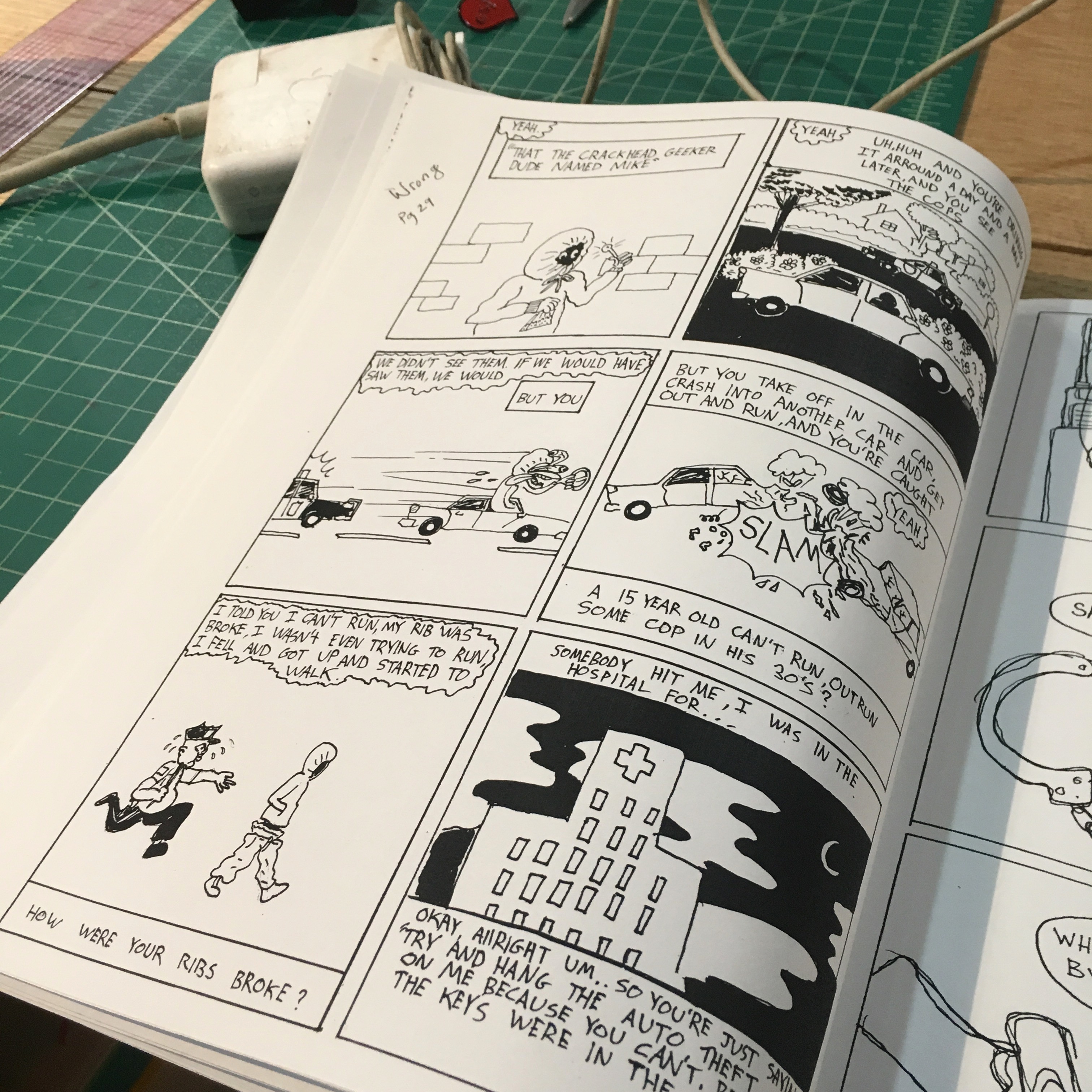 A little over twenty years on, at the time I received the document, Kroll was the head of Minneapolis’ police union, and an outspoken and problematic presence in the city's criminal and social justice dialogue. With the help of comic artist and Uncivilized Books publisher, Tom Kaczynski, I gathered eighteen comics illustrators for a “book sprint.” In one day, around Beyond Repair’s publication space, Transmission, each illustrator took a few pages from the transcript. Without altering the transcript text, in short order, a complete comic was produced illustrating the belittling, lopsided and violent power dynamic between this middle aged man and child.