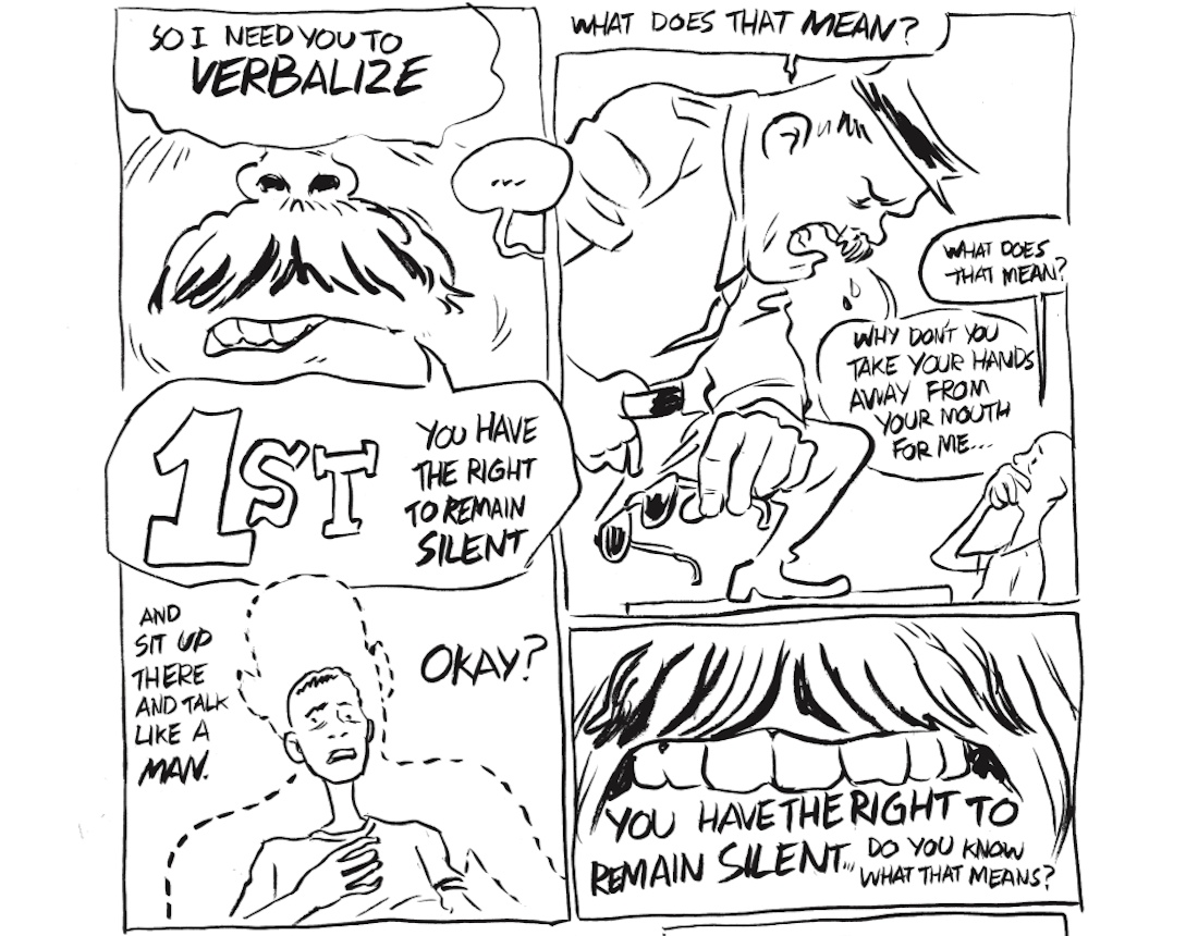 The first 10 of the 32-page illustrated transcript of Minneapolis Police Department Sergeant Bob Kroll’s interrogation of Otis, a 14-year-old black child, continue in a manner that is simultaneously berating and confounding. Otis was in the eighth grade when he was arrested in 1996 for riding in a stolen car in Minneapolis. He maintained his innocence despite Kroll’s repeated attempts to extract a confession from him using the Reid technique, an archaic set of interrogation methods contested by ACLU and American Bar Association for producing false confessions, especially in children. Currently, Bob Kroll (now a Lieutenant) is the controversial union president of the Minneapolis Police Federation, who has admonished the Black Lives Matter movement in the wake of Philando Castile’s fatal shooting by a police officer of St. Anthony, Minnesota, in June of 2016 and Jamar Clark’s death at the hands of a Minneapolis PD officer in November of 2015.